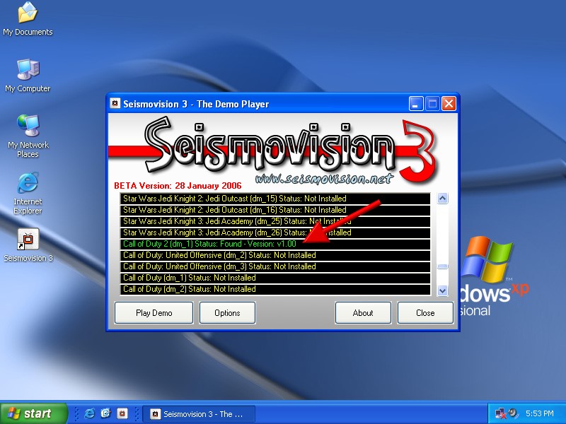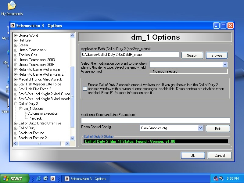 Call of Duty 2 now appears green in the status lines, you may have to scroll down to see this. Click 'Close'. Now Seismovision is configured to play Call of Duty 2 (*.dm_1) demos.