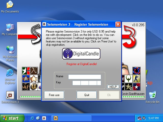 The nag window comes up when you are using the 'free' version of Seismovision 3. Click on the button 'Free Use' to skip registration. The button becomes available after 5 seconds.