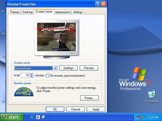Choose 'Screen Saver' from the tab and select 'SeismoSaver' from the screen saver combo selection box. When correctly selected, some game screen shots will be shown in the preview window.