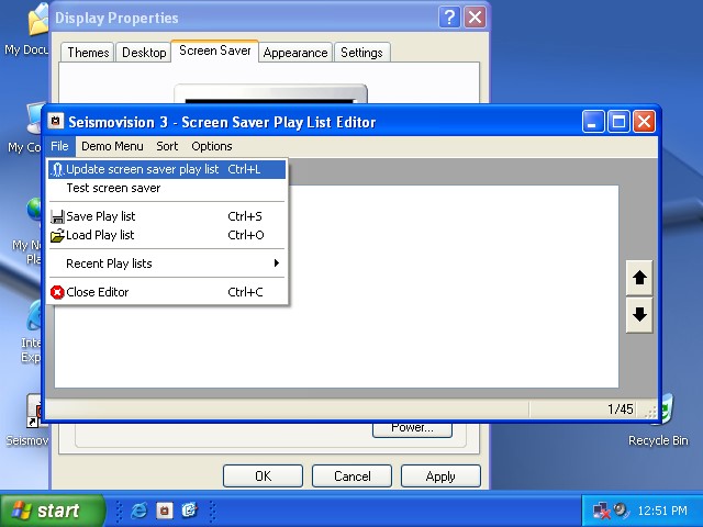 When done editing your play list, you will have to save the screen saver play list. On the 'File' menu select 'Update screen saver play list'. A message box pops up confirming the save. Now you can close the play list editor. Click 'Ok' at Display Properties. Now your screen saver is configured to play demos.