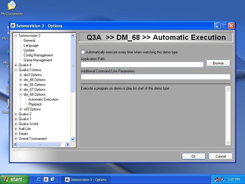 Launch an external program when playing this demo type. You must not put the game path in here. Choose only small programs like WinAmp. Some programs will interrupt demo play. 'Browse' to a program and select it. Setup command line parameters if any and check the 'Automatically execute every time when watching this demo type' check box.