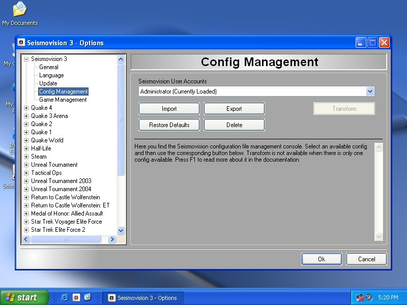 Here can export and import your Seismovision settings. All existing Seismovision configs are listed. The names of the configs are the names of the Windows user account where Seismovision was at least once used. 'Export' lets you save the selected Seismovision config to your hard drive or data medium. The 'Import' button lets you transfer the config back into Seismovision. It will be imported for the currently loaded config and not the selected config. 'Delete' remove the config and Seismovision closes afterwards only when deleting the currently loaded config. 'Restore Defaults' resets all setting in the config. The 'Transform' button is not yet available and will be in a later version.