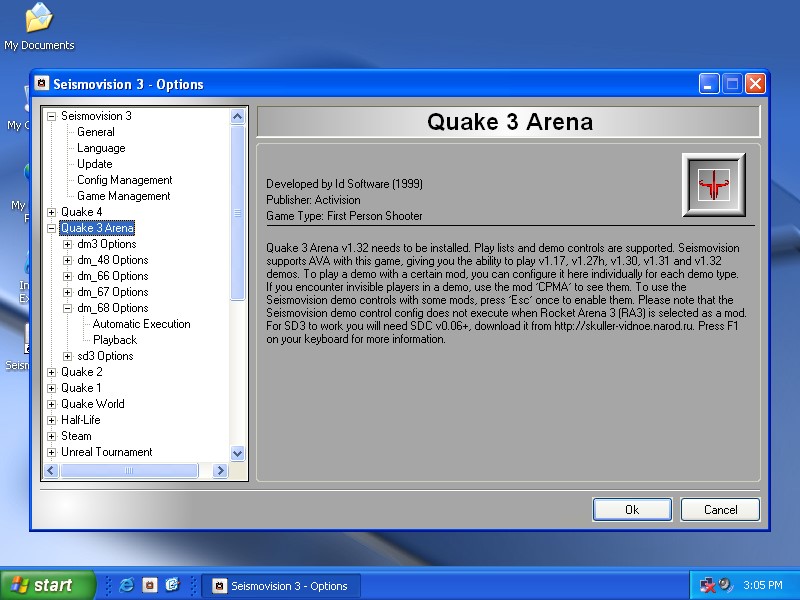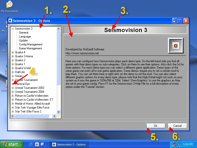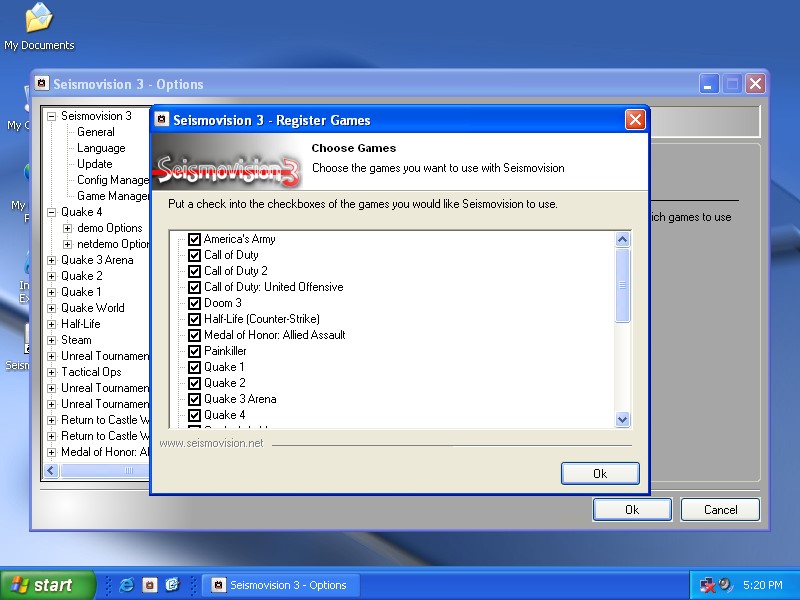 As you have seen during the installation this is the same panel. Put a check mark into the box next to the game name to select it or deselect it to remove. Only selected games will be listed in the options and have file associations. When another demo player or program took over a file association, simple click 'Ok' and all associations are renewed. After clicking 'Ok', Seismovision will refresh its interface to show the changes.