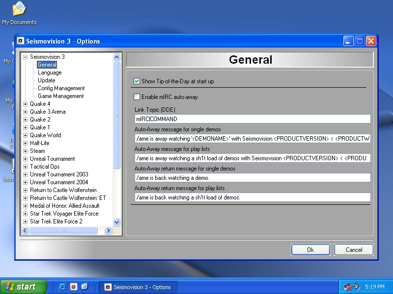 Under general options you can set up to enable or disable Tips of the Day and mIRC auto-away. Tips of the Day display little hints, tricks and other useful information upon start up of Seismovision. These tips do not appear when playing a demo directly. To use mIRC auto-away you need to have mIRC installed and active, you can download it at http://www.mirc.com. In Seismovision 3 you will have to setup the Link Topic (DDE). By default it is set to the mIRC default. When watching a demo, mIRC auto-away can send a message to all IRC (Internet Relay Chat) channels you are currently on to show your friends you are busy watching a demo and cannot respond. You can change these lines to anything you like and mIRC understands.